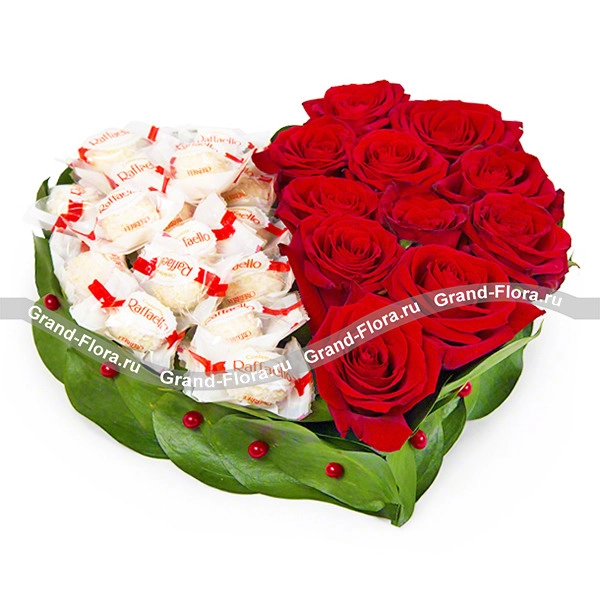 Райское лето - композиция в виде сердца из роз и Raffaello