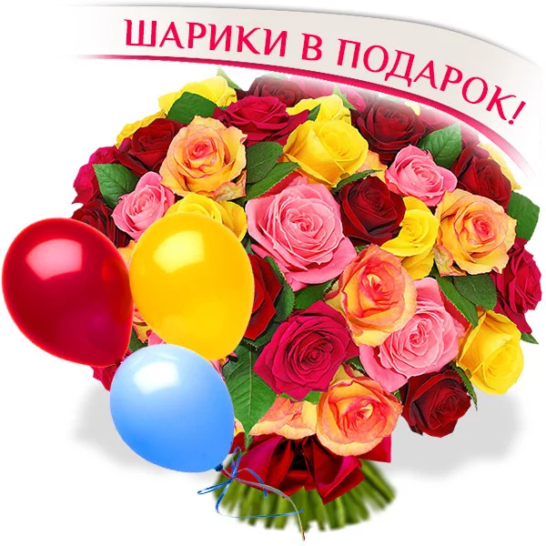 51 роза: роза красная - 51 шт. (высота розы - 50 см), 3 разноцветных шара (красный, желтый, синий).