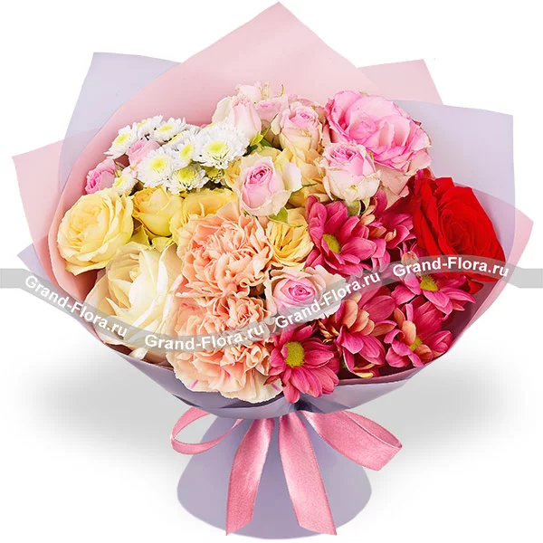 Уменьшенный: роза красная - 1 шт., роза розовая - 1 шт., роза белая - 1 шт., хризантема кустовая розовая - 1 шт., роза кустовая розовая - 1 шт., кустовая роза кремовая - 1 шт., хризантема сантини - 1 шт., гвоздика персиковая - 2 шт., упаковка, лента.