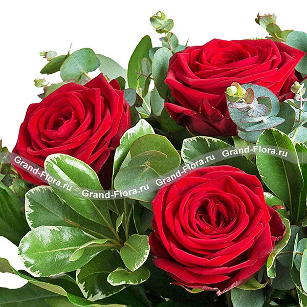 роза красная - 19 шт., рускус - 7 шт., эвкалипт - 5 шт., упаковка, бант красный.